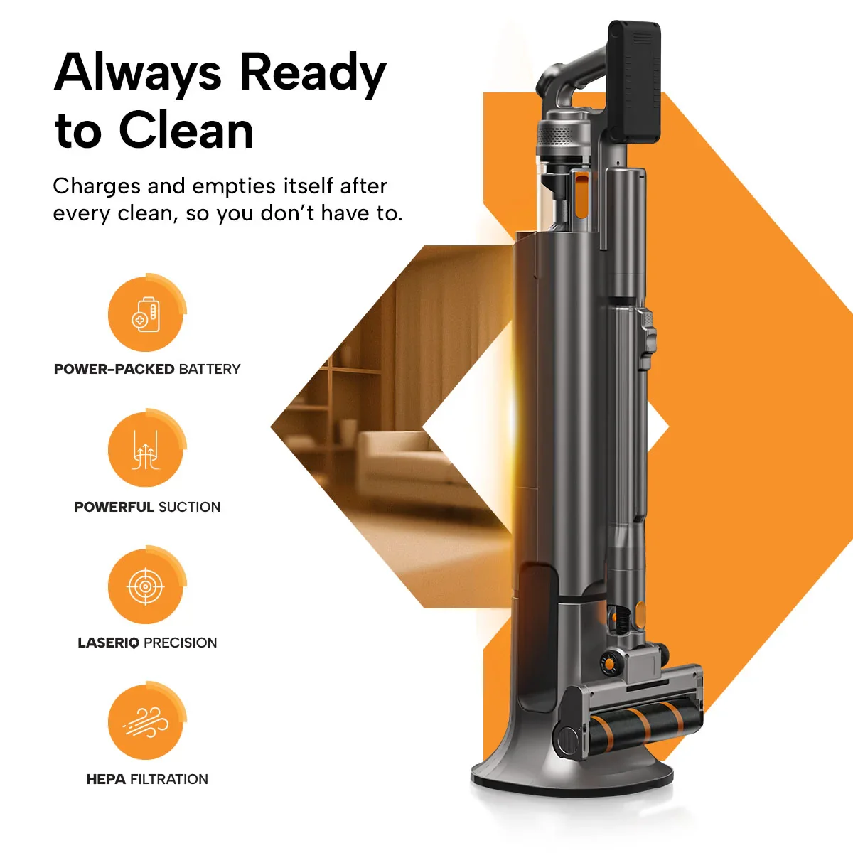 - Always Charged and Ready: Docks automatically recharge the vacuum, so it's always at 100% when you need it.